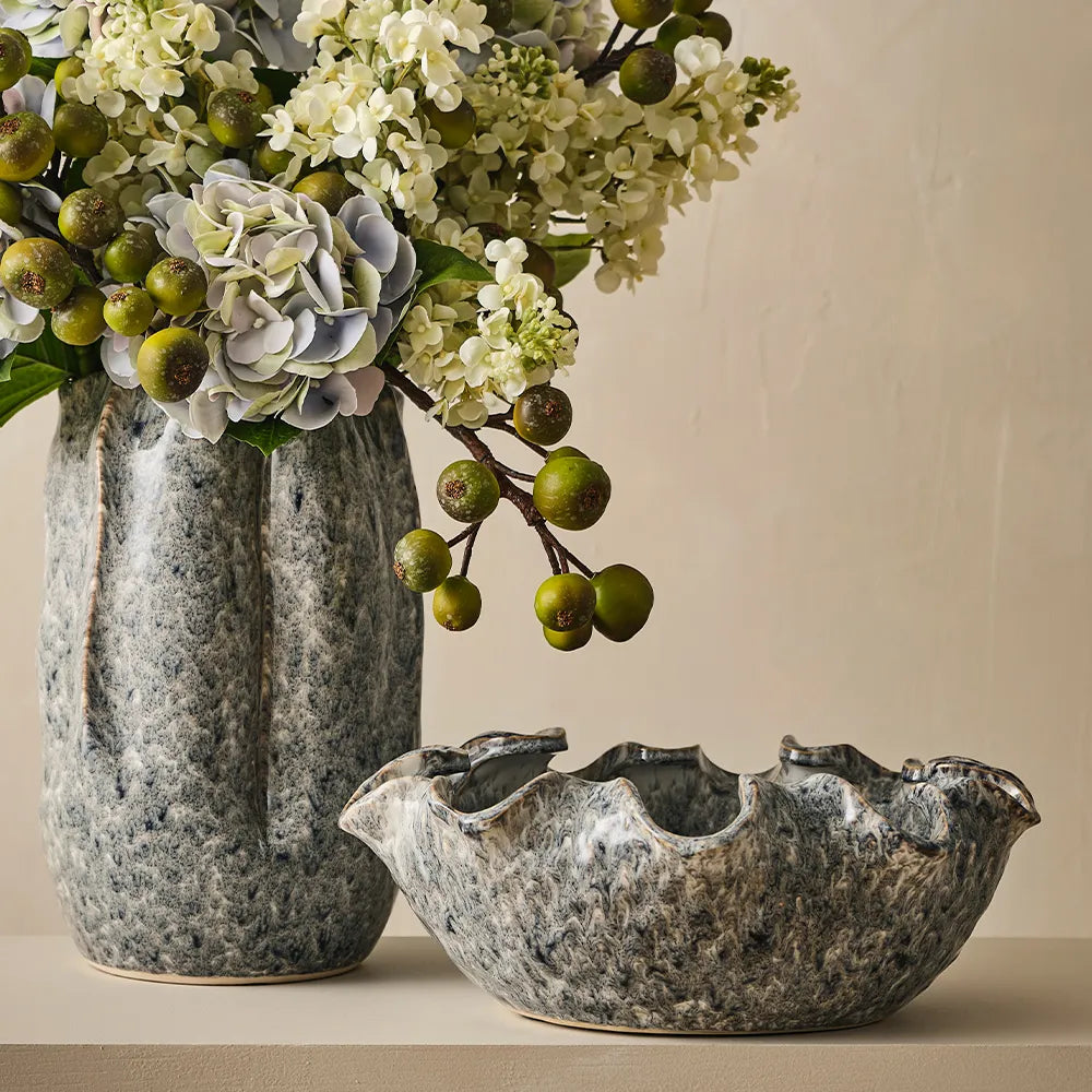 Sculptural and serene, the Olbia ceramics are defined by their petal-like edges and fluid, organic forms. Finished in a soft grey-blue glaze, each piece catches the light beautifully and adds a gentle elegance to your styling. The glazed finish enhances the sculptural curves, making them perfect as standalone pieces or as part of a layered display. A timeless choice with a modern, botanical twist.